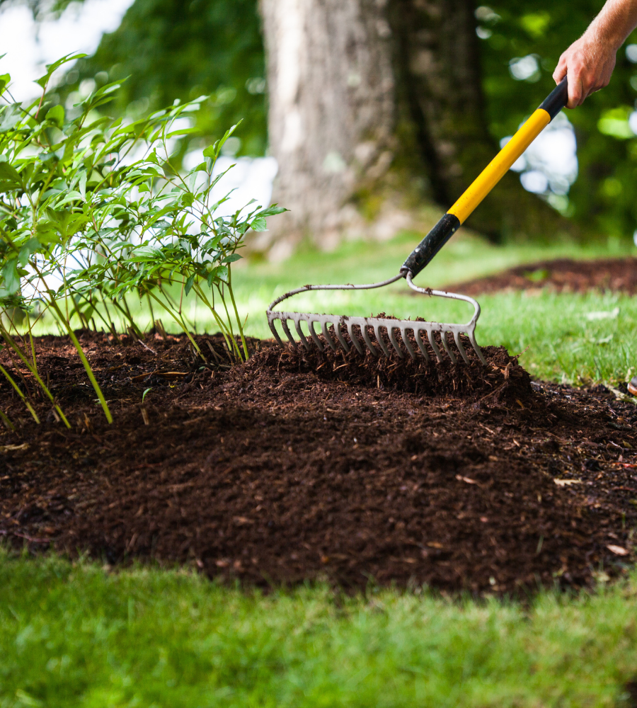 If you’re mulching a flowerbed, remove any obvious weeds first, water thoroughly if it’s been dry, then use a small spade to pile in mounds of mulch. Spread it out with your hands or a rake, tucking it in under any growing foliage and taking care around spring bulb growth