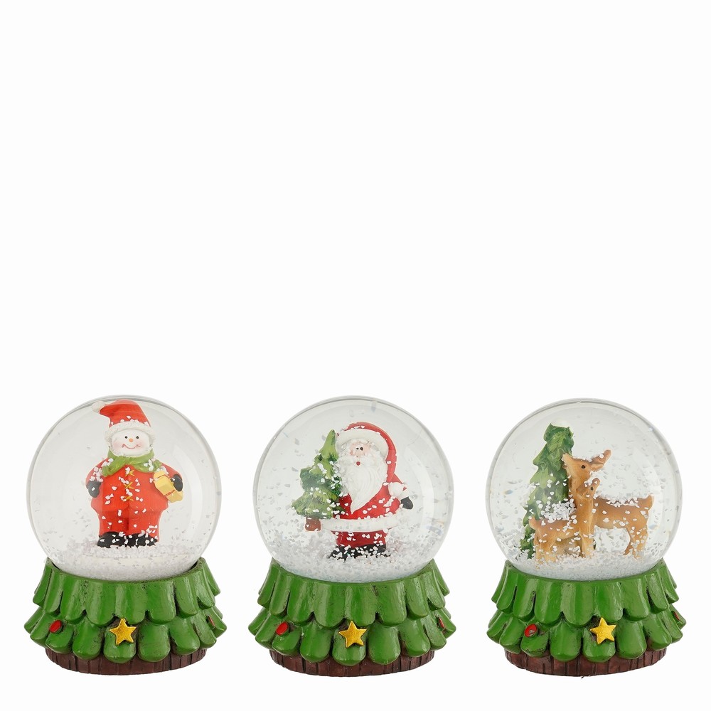 A festive trio of mini-Christmas water globes, each featuring a joyful holiday scene, from Santa holding gifts to a reindeer among snowy trees. Resting on a textured green tree base, each globe comes to life with a gentle shake, filling the scene with a magical snowfall.