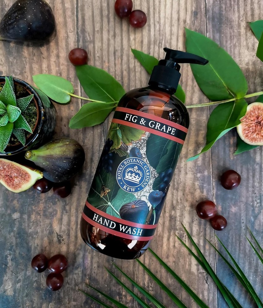 The Kew Gardens Fig and Grape Hand Wash; this fruity fragrance features the scent of fig and grape, with a soft blend of peach and orange. The heart is made up of blond woods and coconut with an oriental base of musks, sandalwood, cedarwood and dry amber.