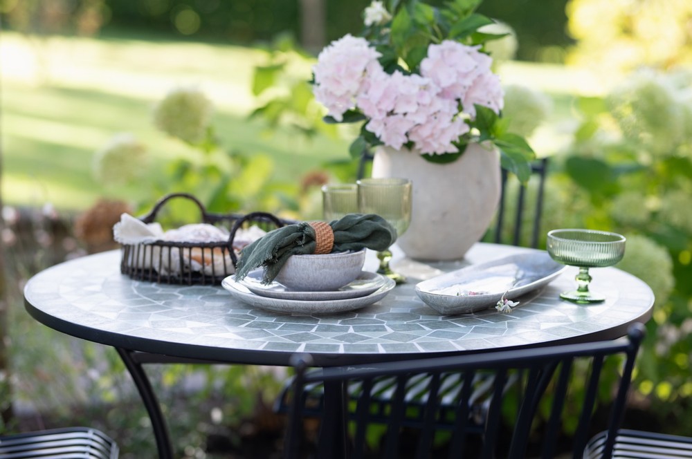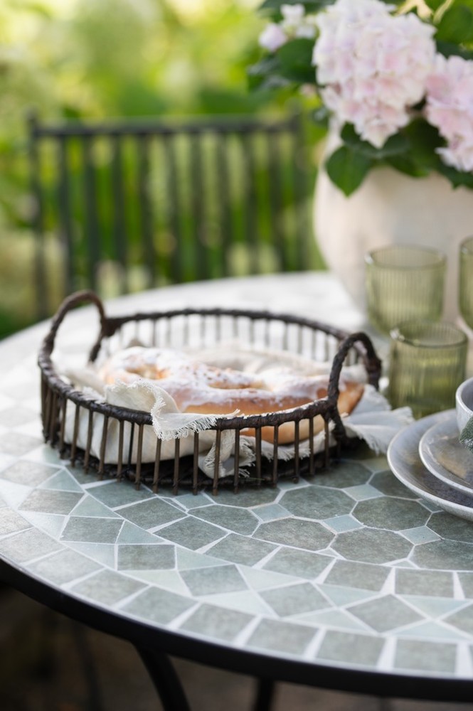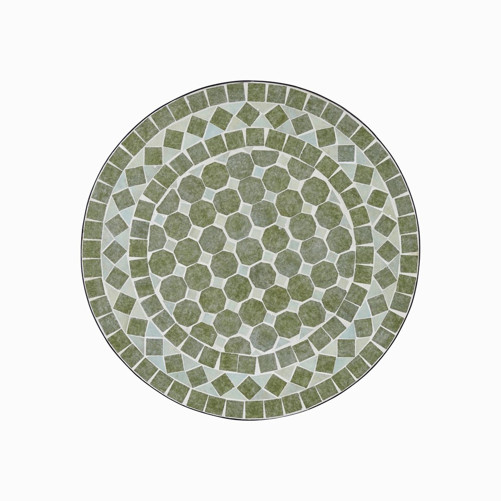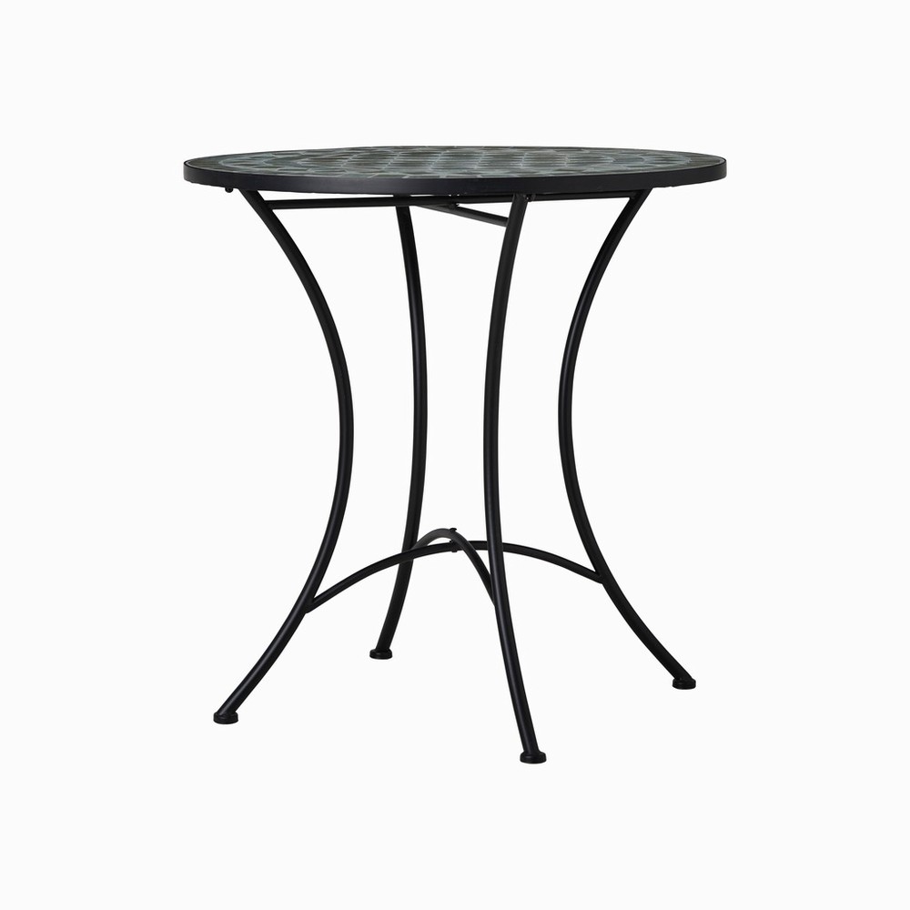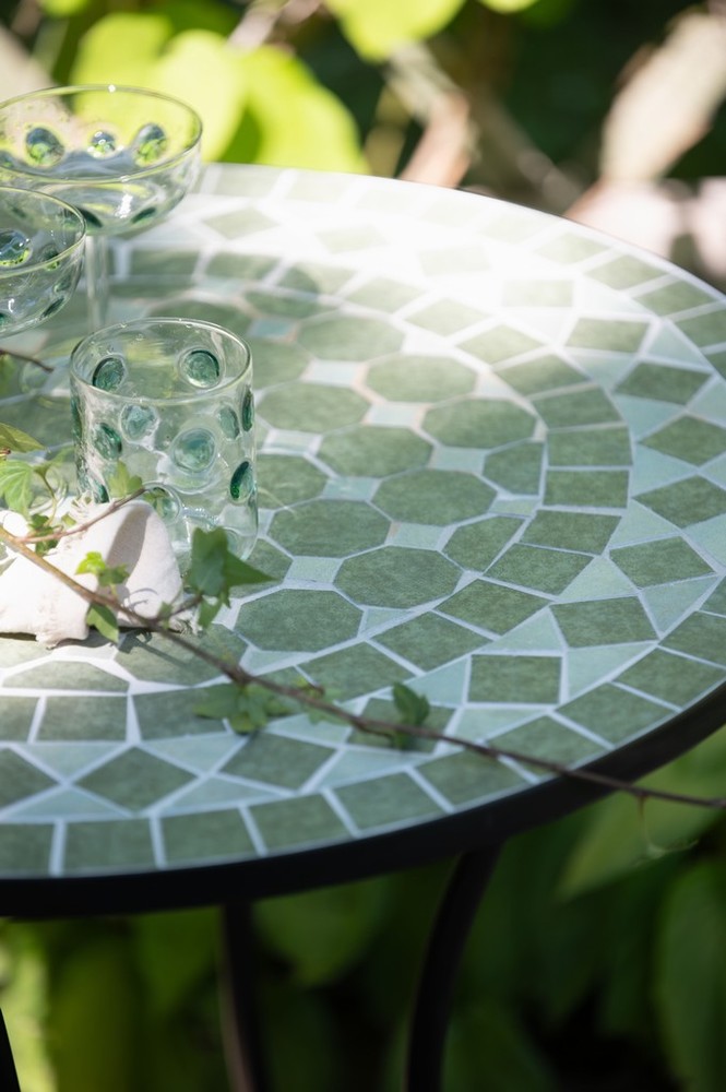 A decorative bistro-style table designed to bring character and detail to smaller outdoor spaces. Featuring a hand-laid ceramic mosaic top in soft green tones, it adds a subtle, Mediterranean feel—perfect for balconies, patios or tucked-away garden corners.